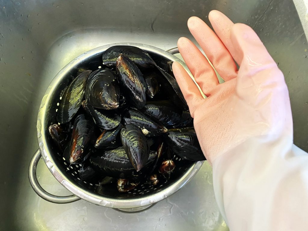 Lo primero que hay que hacer antes de cocinar es limpiar los mejillones. En agua fría / fresca hay que sacarle las algas y piedritas que se vean en la superficie para evitar que después ensucien nuestro caldo.