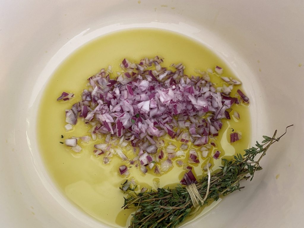 - En una olla de buen tamaño con aceite de oliva a temperatura media alta ponemos un bouquet hecho con las ramas de tomillo, paseándolo por el aceite para que este se infusione un par de segundos. Sumamos la cebolla y el ajo y revolvemos durante un par de minutos.