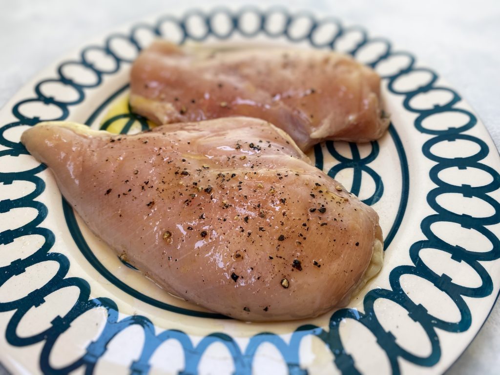 💚 Salpimentamos y sellamos 4 pechugas de pollo hasta que tengan un buen color. Las llevamos en una fuente al horno a 180ºC hasta que alcancen una temperatura interior de 74ºC -hasta que esté cocido.