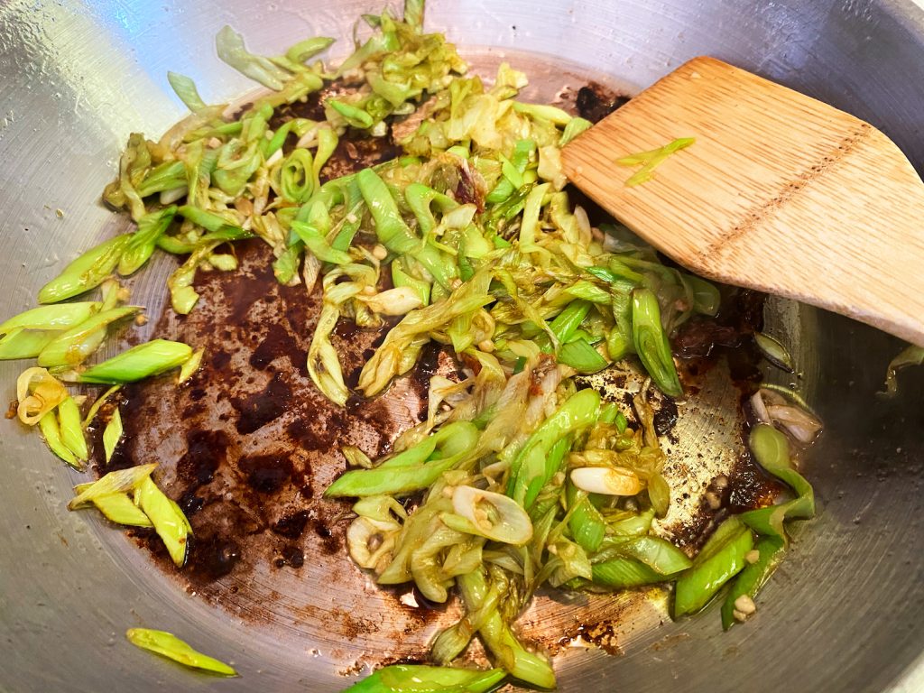 💚 En la sartén donde sellamos, sofreímos con un poquito de mantequilla y aceite de oliva: 1 puerro picado diagonalmente junto con 1 diente de ajo picado muy fino -lo ponen el último minuto para que no se queme. Cuando el puerro esté blando sumamos 1/4 de taza de vino blanco y revolvemos para evaporar el alcohol.