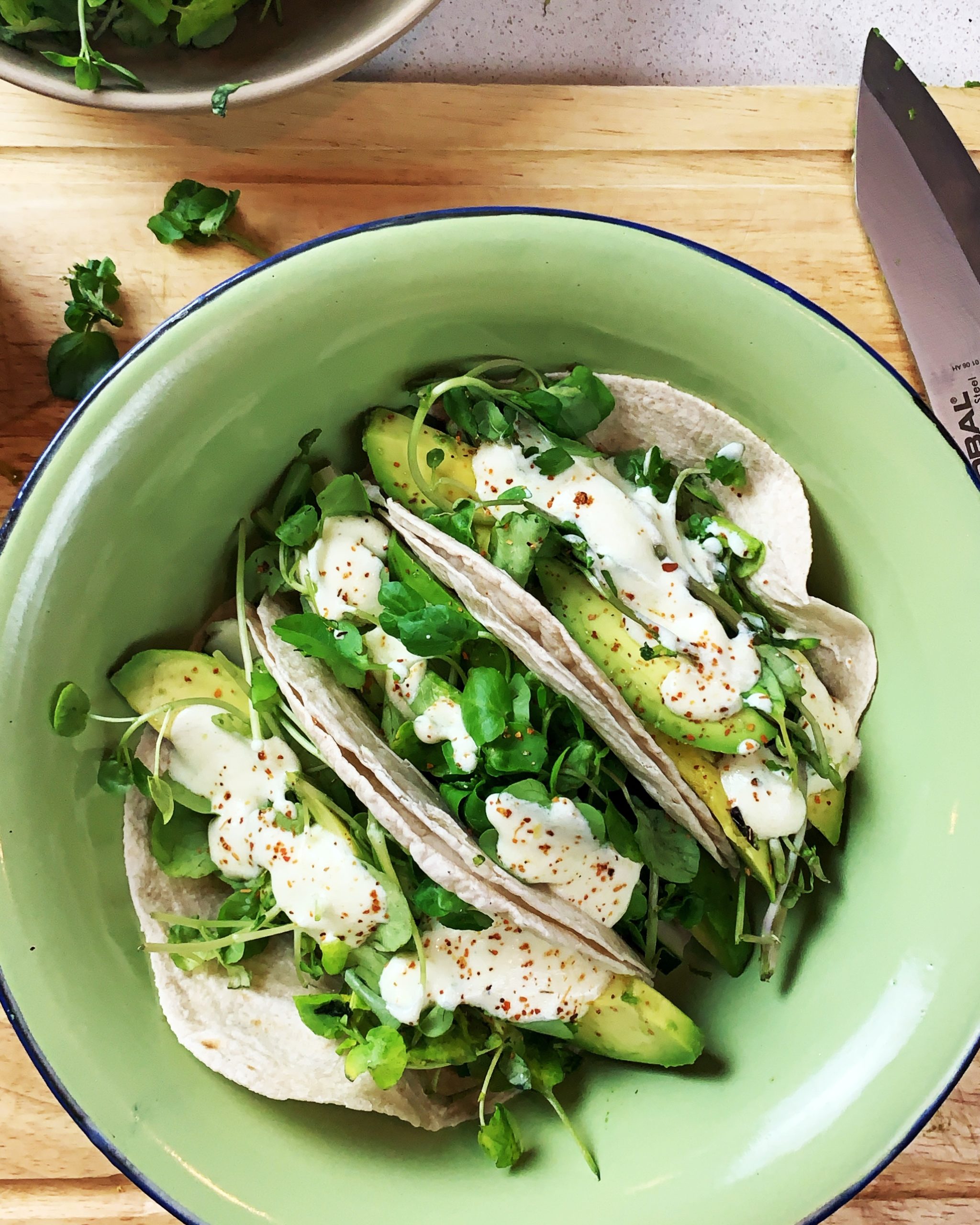 💚 Preparamos los wraps, empezando por tomar 1 tortilla y pasarle “una pincelada” de pesto por el centro, y sobre esta, montamos todos los verdes hasta terminar con varias cucharaditas de la salsa de yogurt. Repetimos con todas las tortillas, yo hago unas 3 por persona para cenar.